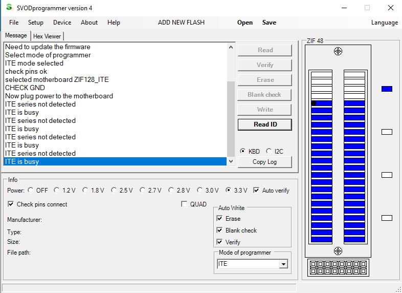 Merhaba yeni svod4 cihaz aldım lenovo gs44d/g554d nm-c711 anakart var it8227e I/o var programlayici yapamadım anakart klavye girişinden bağladım gnd bağladım anakart model svod4 download yaptim pin check yaptım anakart modelini sectim read id tıklıyorum ite is busy çıkıyor klavye grisi degilde svod4 L2C secersem birşeyler yapıyor resim olarak ekliyorum yardımcı olabilirmisiniz.