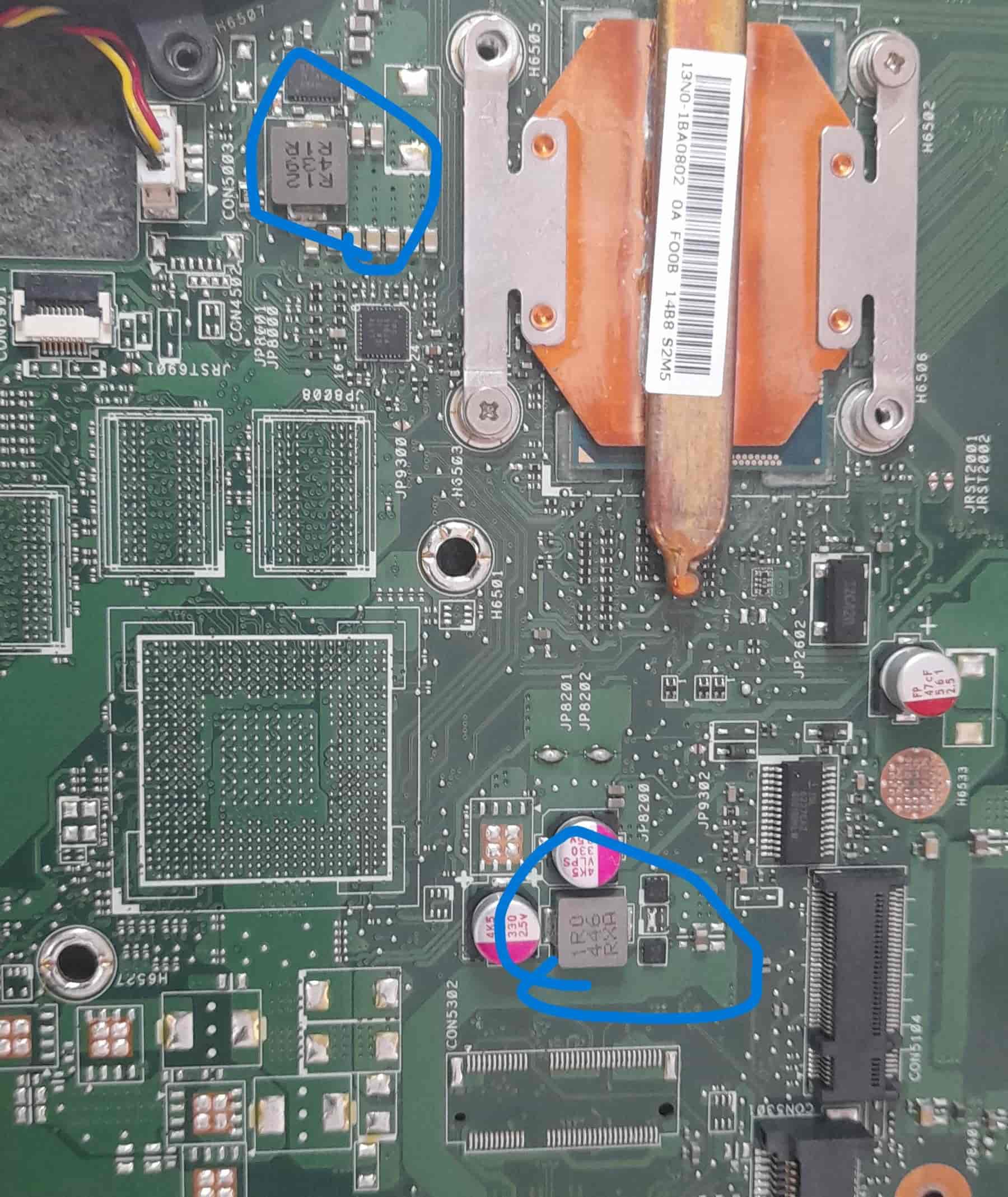 işlemcinin üstünde fanın yanında bobin ar 0.8 yan tarafında var 2 adet kapasitör arasında oda 0.8 ohm gösteriyor ama işmeci arkasında ki kapasitörlerde kısa devre yok